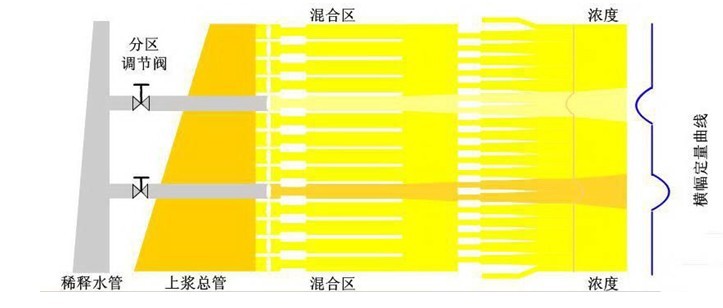 在流漿箱上加裝智能稀釋水調(diào)節(jié)裝置,調(diào)節(jié)流漿箱橫幅方向分區(qū)濃度的方法調(diào)節(jié)橫幅定量,可以使成品紙張的橫幅定量差比傳統(tǒng)的方式減50%~80%。同時(shí)因?yàn)橄♂屗{(diào)節(jié)閥幾何尺寸小,可以使橫向調(diào)節(jié)間距減少至60mm。這種控制方式使橫幅定量差更小,調(diào)節(jié)更加方便。